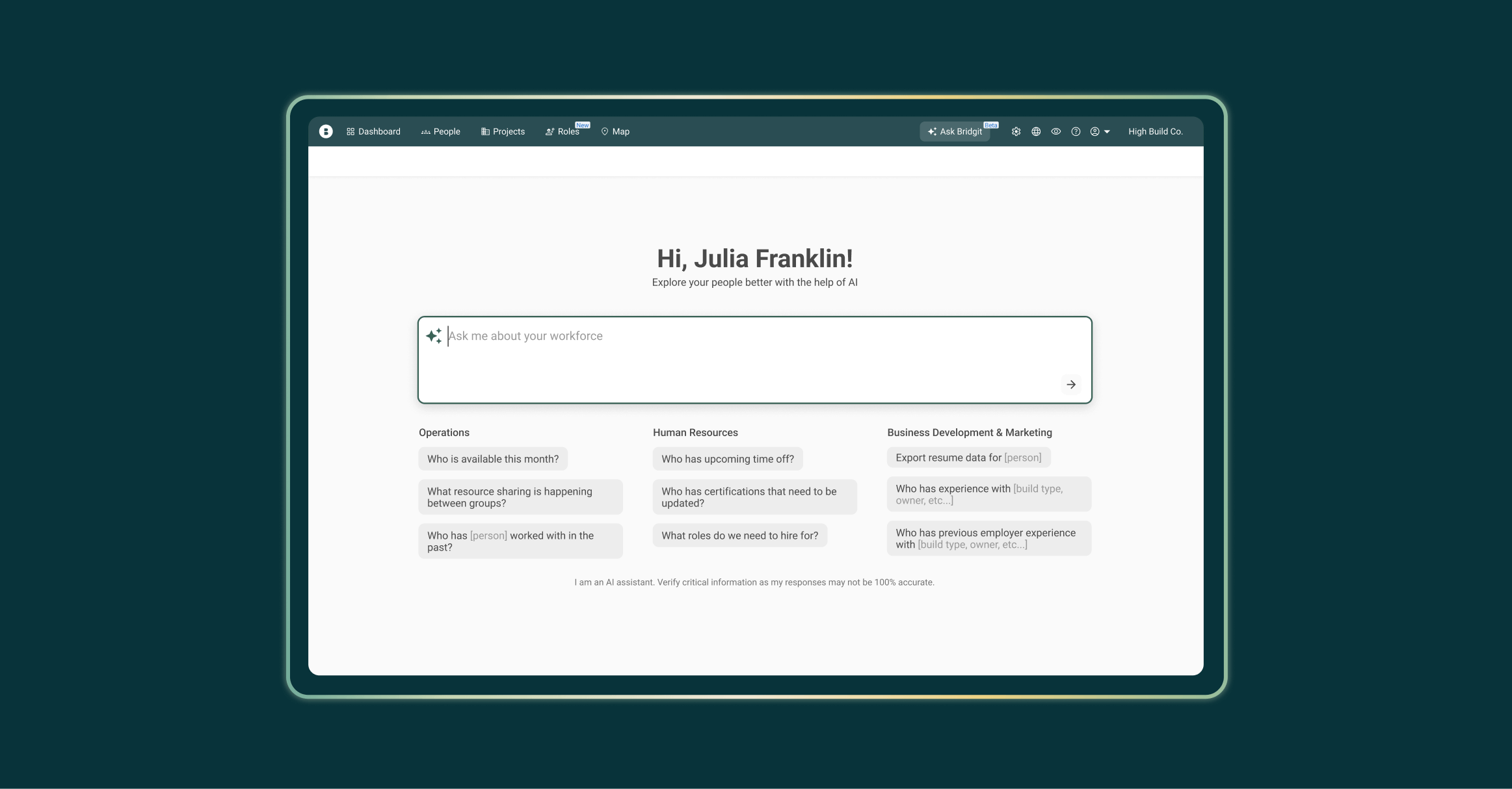 - Ask Bridgit — A conversational AI assistant that understands a company’s workforce data. Ask questions like “who has healthcare experience?” or “what resources are shared across my groups?” to uncover insights and generate reports that help your team make better decisions, faster.