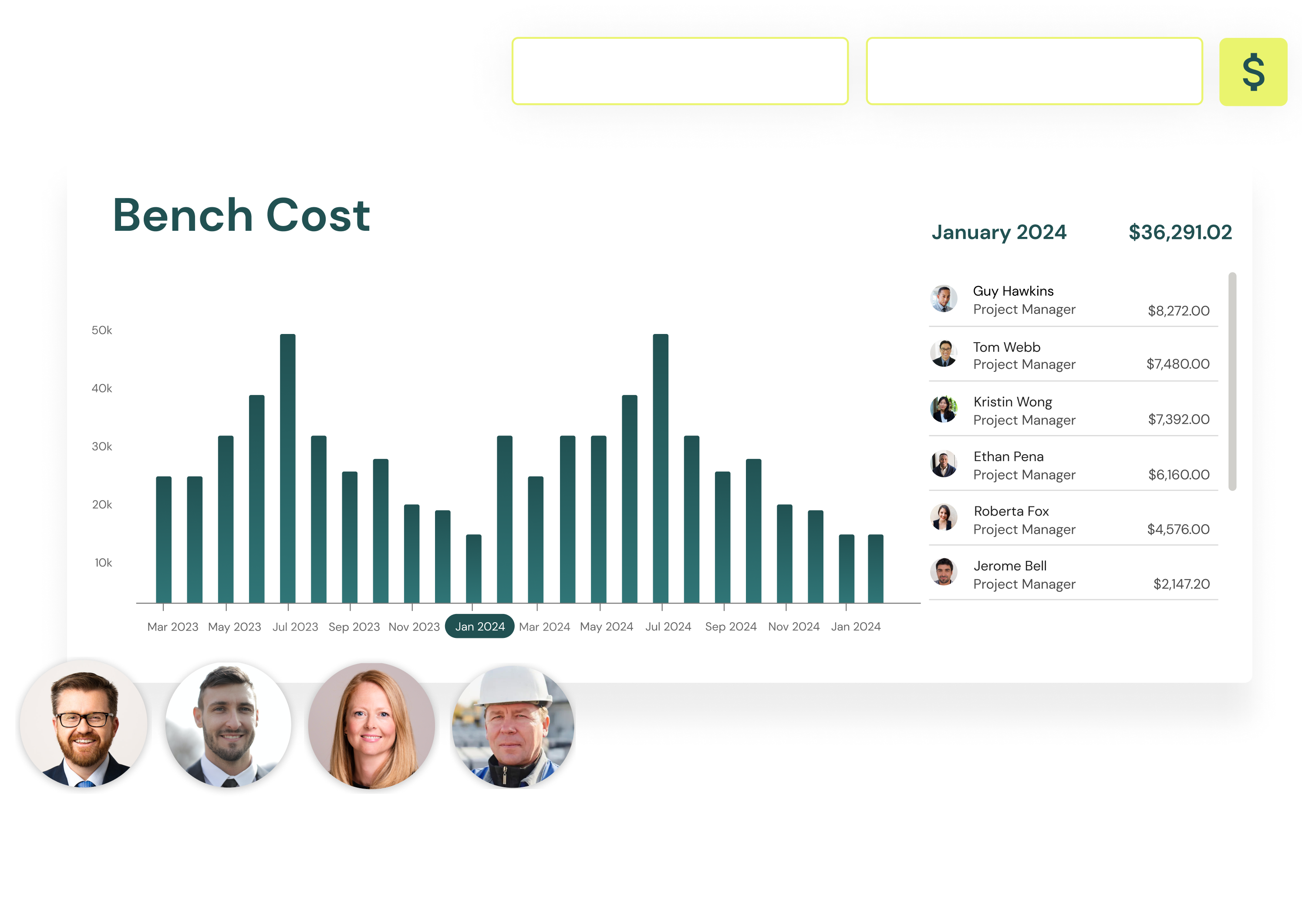 The Bench Cost module shows you the total cost of the people who are under-utilized or haven’t been assigned jobs. With easy-to-understand visuals, you have immediate insight into how much money you could be leaving on the bench.