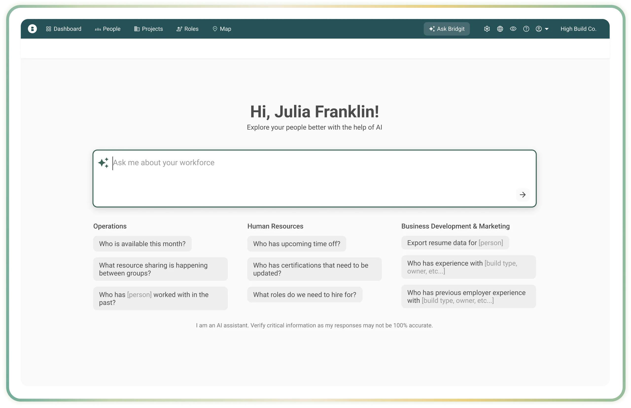 Bridgit AI is your 24/7 workforce planning assistant. It turns messy workforce data into helpful insights so your entire company can understand your workforce better. Most importantly, it helps you make faster decisions and build high-performing teams.